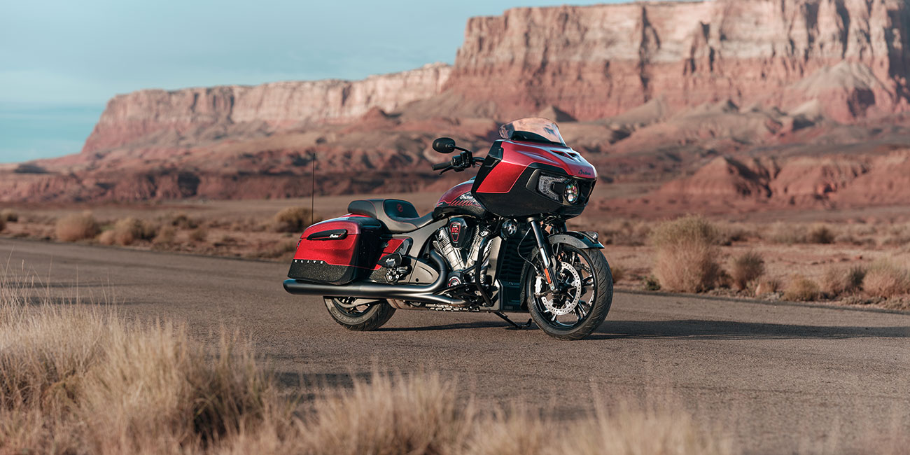L’Indian Challenger Édition 125e Anniversaire met l’accent sur la performance et la maîtrise. Sa tête de fourche montée sur le chassis, ses finitions noires et son moteur PowerPlus 112 ci à refroidissement liquide sont accompagnés de détails peints à la main et de badges spécifiques du 125e anniversaire.