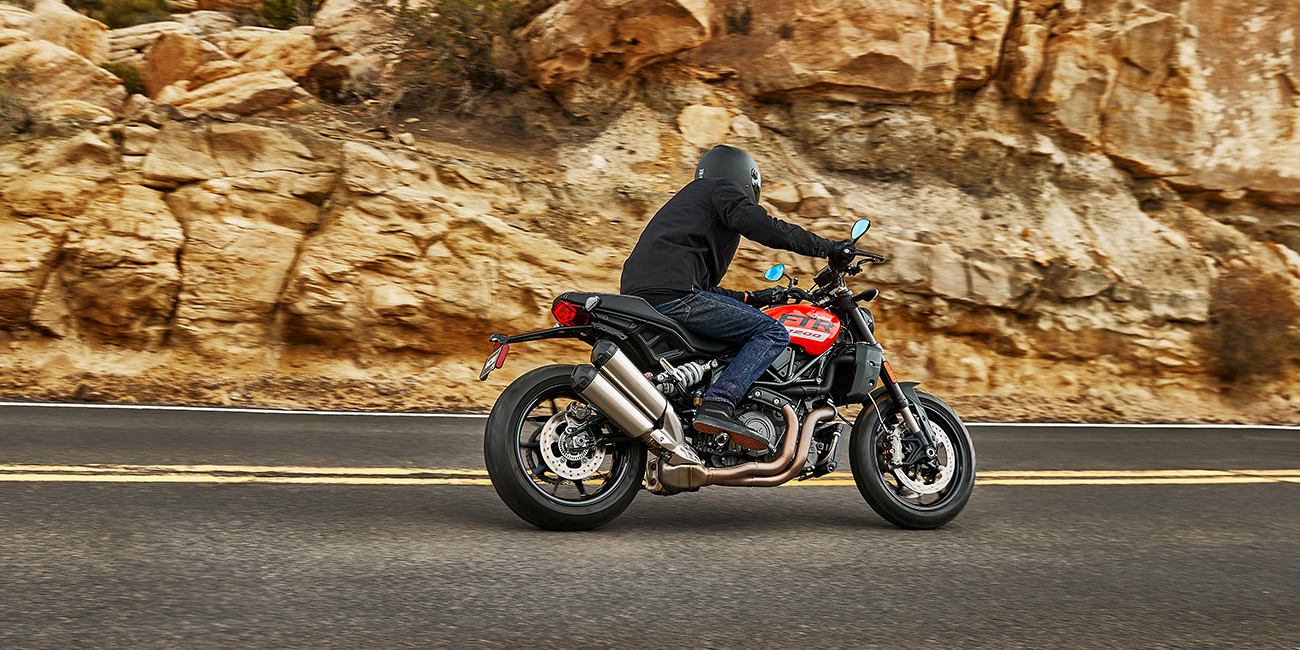 Le caractère d’un bicylindre en V américain à haut régime et à refroidissement liquide est unique en son genre – et celui de la FTR est loin de faire exception. Avec son couple de 120Nm, son moteur de 1 203 cm3 présente deux facettes : l’une, civilisée, est idéale pour la conduite en ville. L’autre, plus sauvage, n’attend qu'une seule chose : que vous ouvriez la poignée des gaz, pour vous montrer ce dont elle est réellement capable.